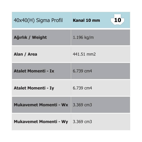 40x40(H) Sigma Profil Kanal 10, hafifliği, dayanıklılığı ve modüler yapısı ile endüstriyel projelerde en çok tercih edilen profil tiplerinden biridir. CNC Dünyası güvencesiyle sunulan bu ürün; CNC makineleri, otomasyon hatları, taşıyıcı sistemler, raf ve tezgah yapıları gibi birçok alanda yüksek performans sağlar.