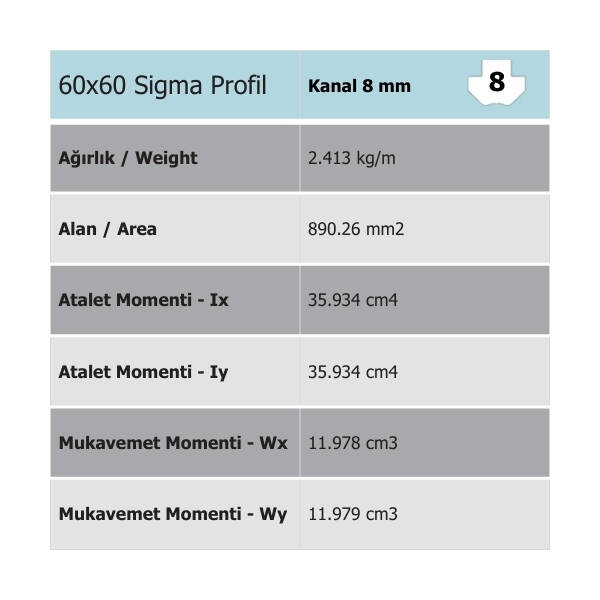 60x60 Sigma Profil Kanal 8, dayanıklılığı ve modüler yapısı ile endüstriyel projelerde sıkça tercih edilen profil tiplerinden biridir. CNC Dünyası güvencesiyle sunulan bu ürün; CNC makineleri, otomasyon hatları, taşıyıcı sistemler, raf ve tezgah yapıları gibi birçok alanda yüksek performans sağlar.
